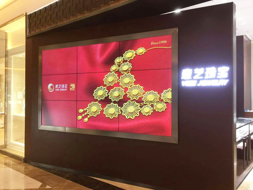 惠藝珠寶公司采用線上、線下的黃金珠寶飾品銷售方式,在惠州市中心的珠寶門店率先采用廣州信弘公司46寸3X3超窄邊液晶拼接屏,這也是一種創新的產品宣傳方式,在珠寶賣場安裝拼接大屏幕極大提升了產品的檔次和門店的形象。同時珠寶門店如有新的促銷活動可在大屏幕上不定期發布,這樣會極大聚集更多人氣,珠寶飾品的銷量必定會不斷攀升。 拼接屏的投入使用,就相當于公司請了一位免費的超級珠寶飾品推銷員,把公司各種在售產品在大屏幕上滾動播放,46寸高清液晶拼接大屏幕與精美的珠寶飾品宣傳畫冊的完美展現,畢將成為整個商場最吸引顧客眼球的地方。